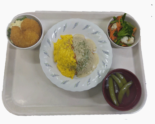 ホワイトソースのオムライス、エビカツタルタルソース、春野菜サラダ、コンソメスープ