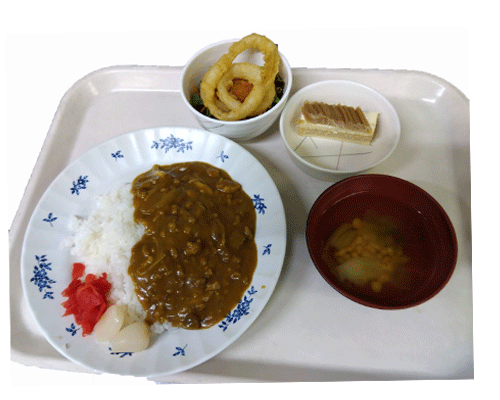 冬野菜(大根・かぶ)と豚肉カレー、チーズコロッケ、コーヒーゼリー、みそ汁