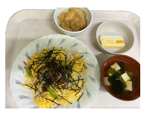 ちらし寿司、ささみの梅しそ竜田揚げ、菜の花の辛子和え、すまし汁、アップル&ピーチケーキ