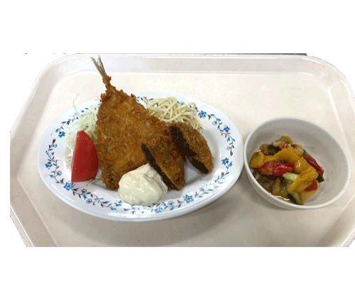 ジャンボアジフライとヒレカツ、ポテトきのこベーコンのマヨソテー