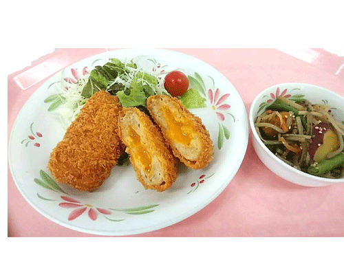 クリームコロッケ2種(クリーム・ビーフカレー)、牛肉サラダ、カボチャケーキ、コンソメスープ