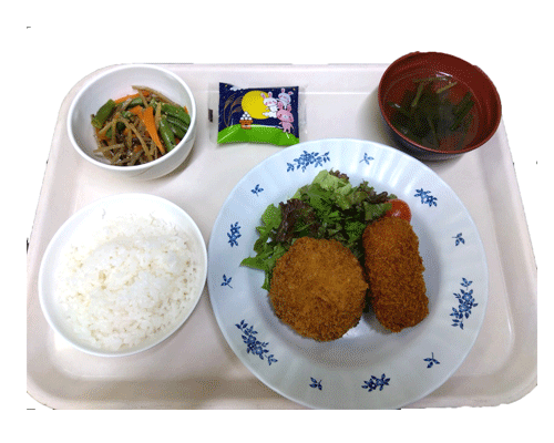お月見ハンバーグ、イカメンチカツ、ピーチゼリー、白米、味噌汁