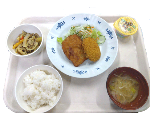 大葉とチーズのチキンカツ、枝豆コーンサラダ、甘夏ゼリー、コンソメスープ、白米